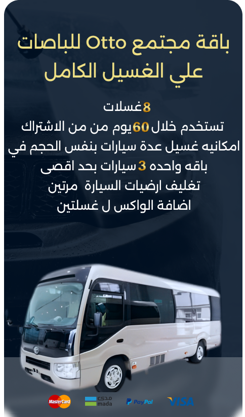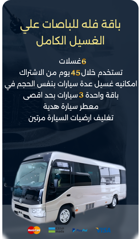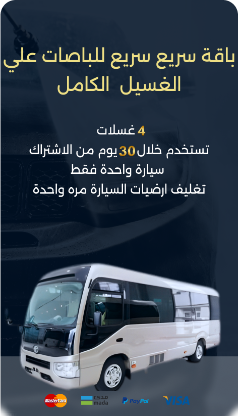 فرع الخــــــــــرج ( غسل متنقل ) باص 30 مقعد 360ريال بدل من 480 ريال 240ريال بدل من 320 ريال 470ريال بدل من 640 ريال 580 ريال بدل من 800 ريال لماذا نحن؟ خدمات احترافية فريقنا مدرب على تقديم أعلى معايير الجودة في كل خدمة سهولة وراحة اختر الباقة التي تناسبك، واستمتع بمتابعة سير الخدمة بكل سهولة تقنيات متقدمة نستخدم أحدث التقنيات لضمان بقاء سيارتك في أفضل حالاتها