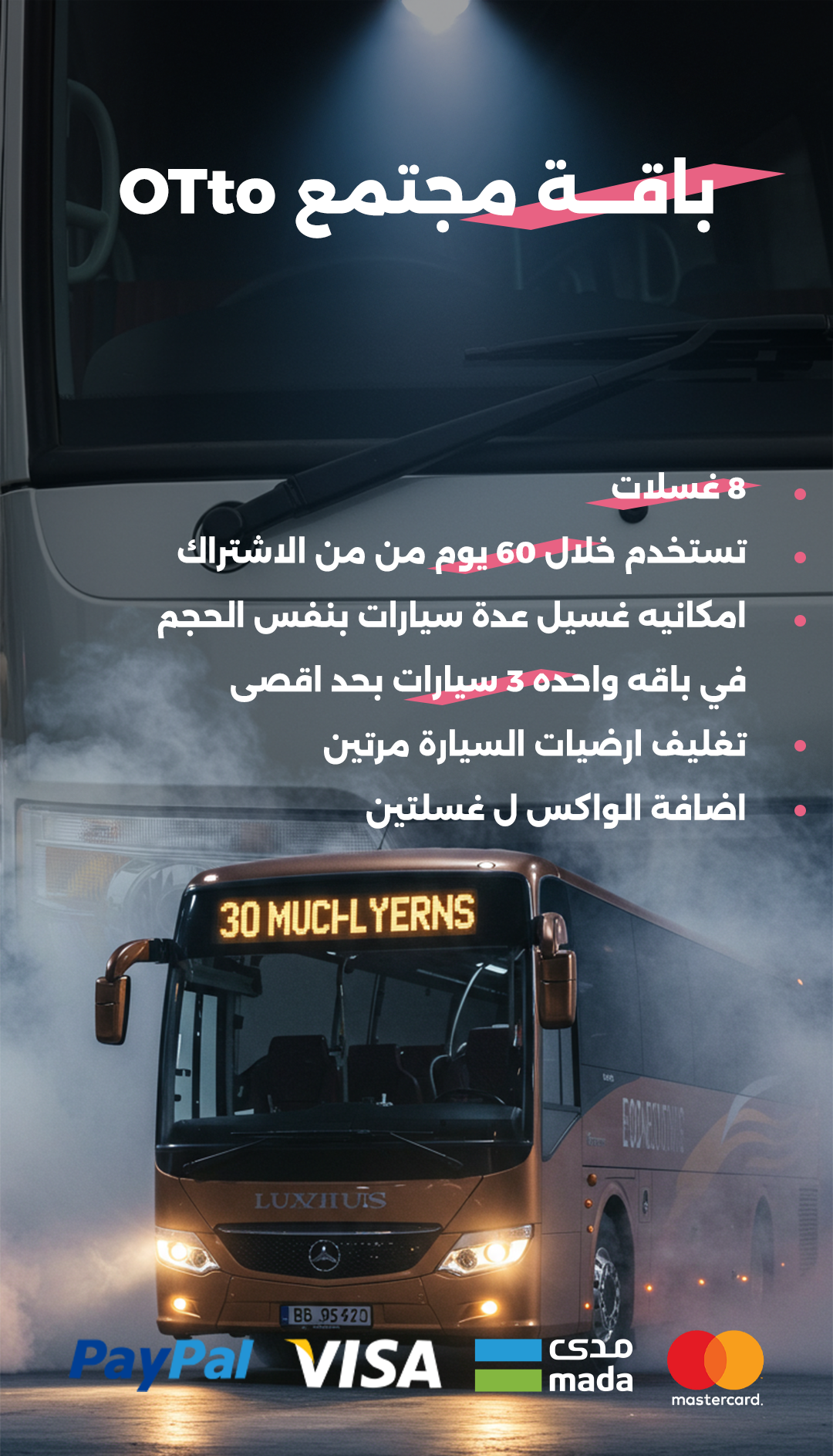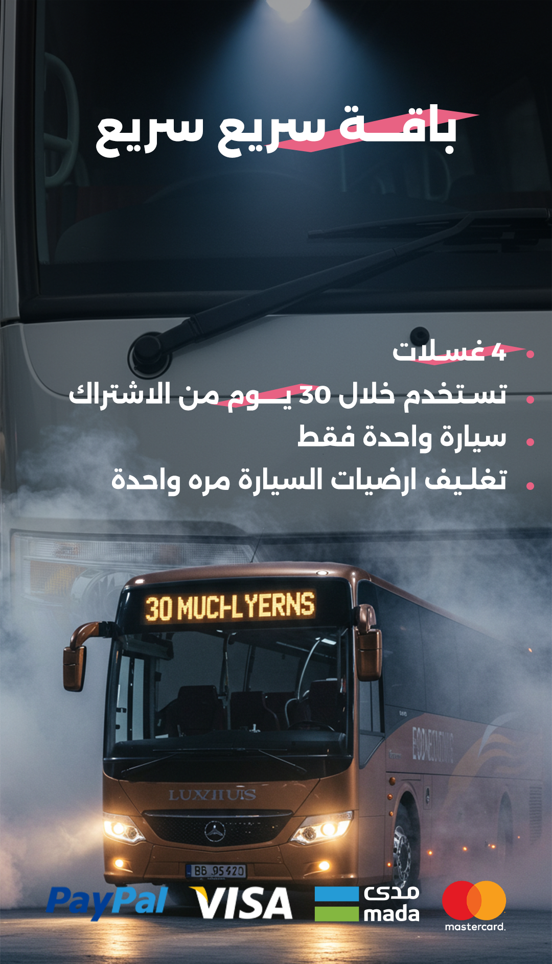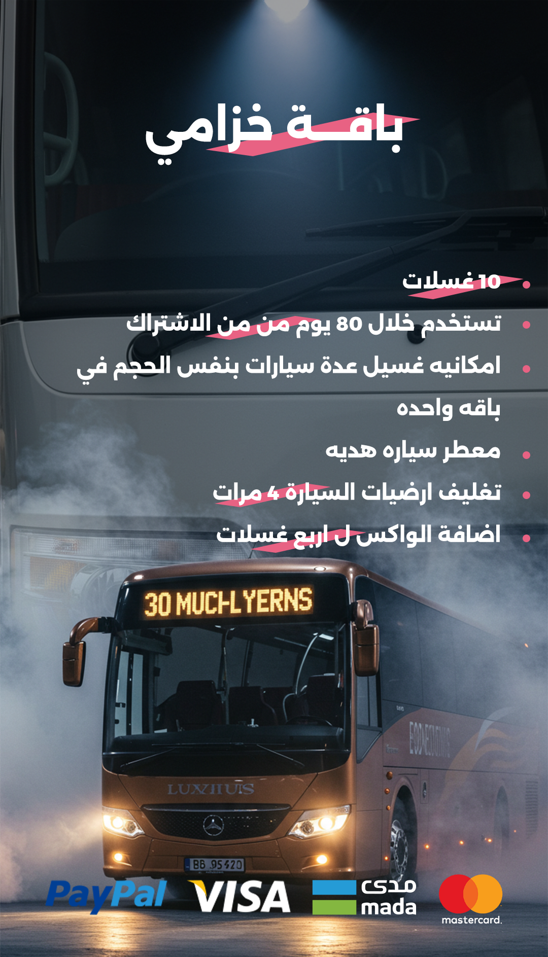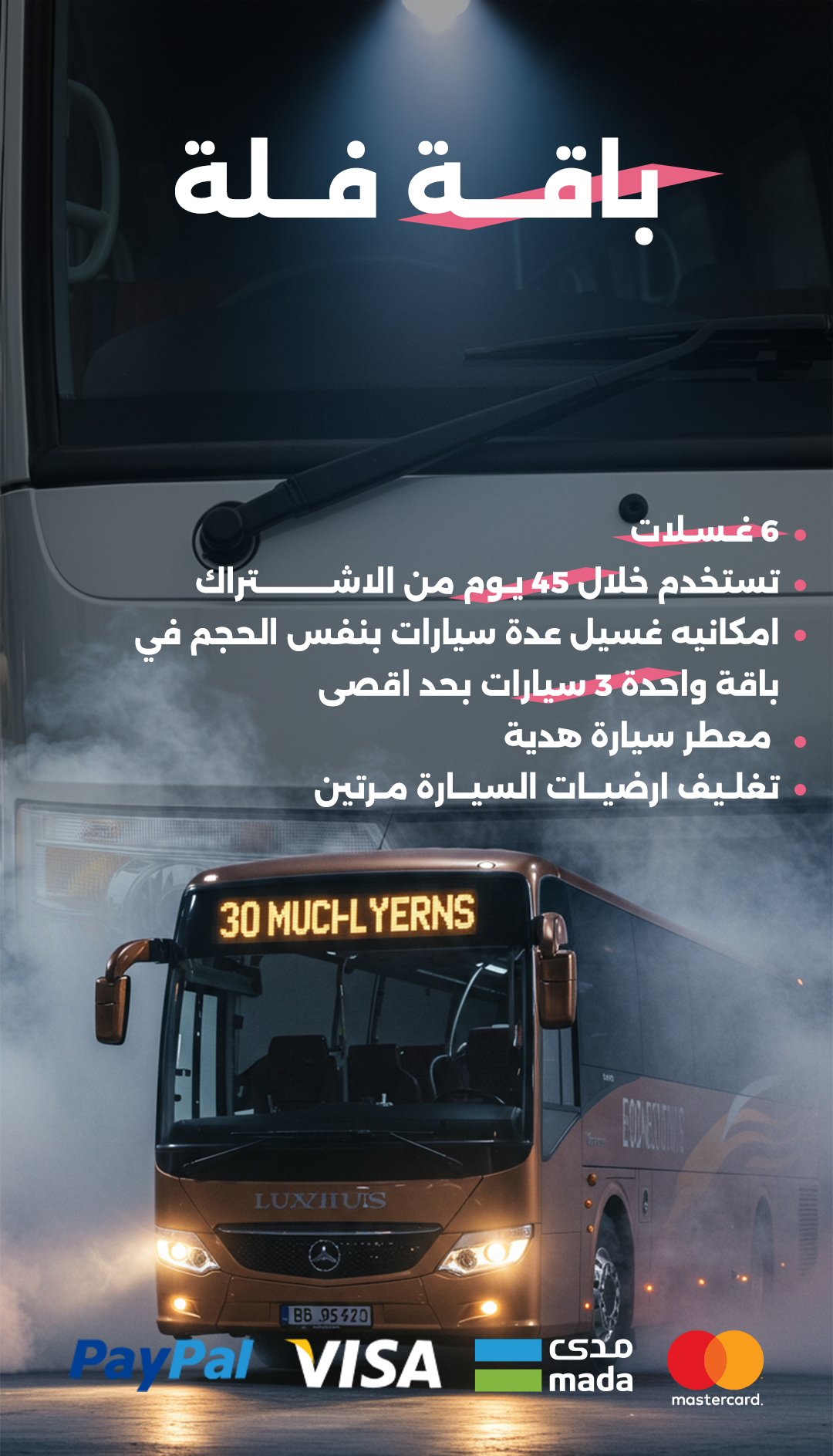 فرع الخــــــــــرج باص 30 مقعد 260ريال بدل من 360 ريال 180ريال بدل من 240 ريال 340ريال بدل من 480 ريال 420 ريال بدل من 600 ريال لماذا نحن؟ خدمات احترافية فريقنا مدرب على تقديم أعلى معايير الجودة في كل خدمة سهولة وراحة اختر الباقة التي تناسبك، واستمتع بمتابعة سير الخدمة بكل سهولة تقنيات متقدمة نستخدم أحدث التقنيات لضمان بقاء سيارتك في أفضل حالاتها
